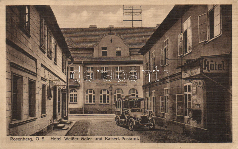 Olesno, Rosenberg Hotel Weisser Adler, post office, automobile https://www.darabanth.com/hu/172-Gyorsarveres/172.0/Kepeslapok/Lengyelorszag~5000035/Olesno-Rosenberg-Hotel-Weisser-Adler-post-office-automobile~II582506