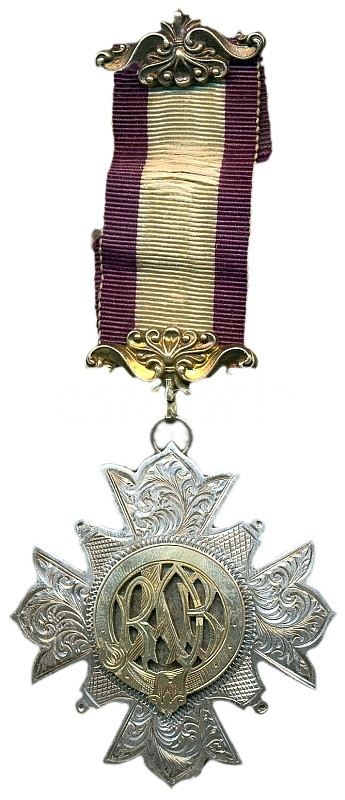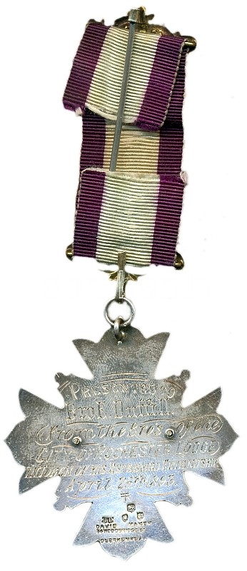 Great Britain / Rochester. April 25th 1893. Decorative handmade freemason silver decoration on ribbon with mint marks. Rs.: "Presented to Bro E. Duffill from the Bros of the City of Rochester Lodge in token of his esteemed Friendship" (Clerkenwell / Woodbridge St.) 54mm/16.3g C:XF