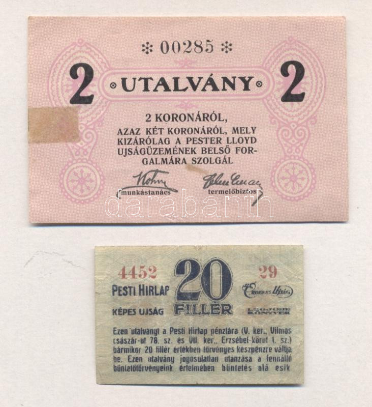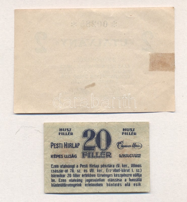 Budapest DN. "Pesti Hírlap" 20f (2x) + "Pester LLoyd" 2K T:Vegyes https://www.darabanth.com/hu/172-Gyorsarveres/172.0/Numizmatika/Magyar-es-kulfoldi-papir-es-fem-szuksegpenzek-penzhelyettesitok-~5000104/Budapest-DN-Pesti-Hirlap-20f-2x-plus-Pester-LLoyd-2K-TVegyes~II587800