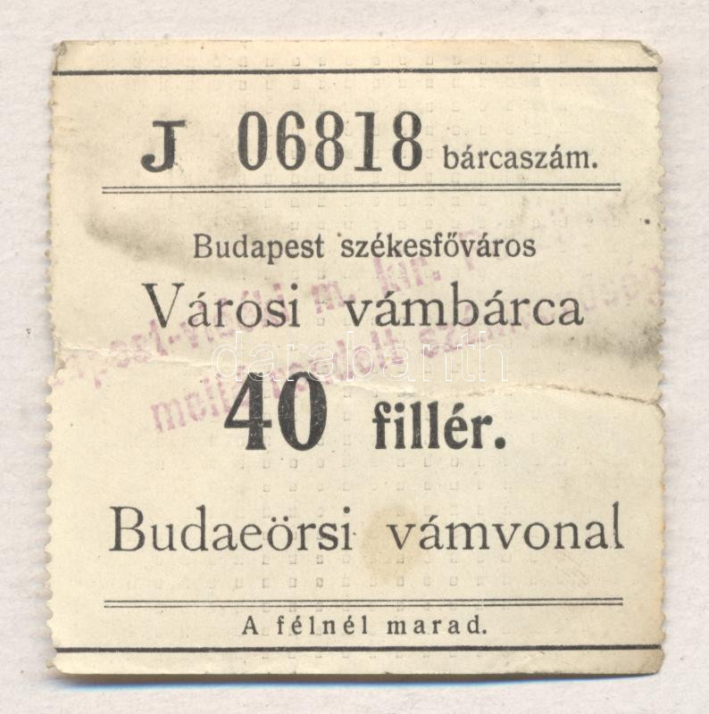 Leírás: Budapest / Városi vámbárca 40f Budaeörsi vámvonalra T:II- (beszakadás)