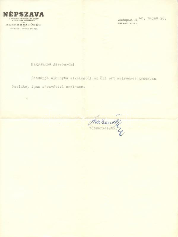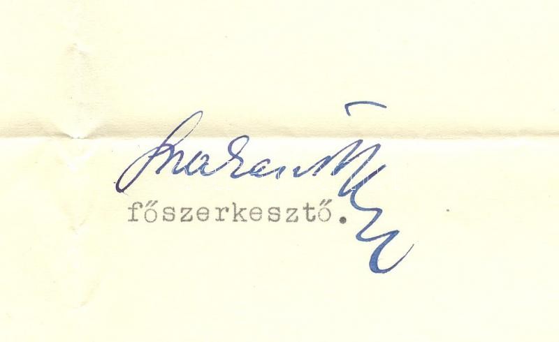 Leírás: Szakasits Árpád későbbi köztársasági elnök, aláírása a Népszava főszerkesztőjeként