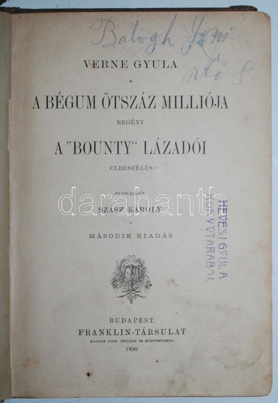 Verne Gyula: A Bégum ötszáz milliója. Bp. 1890. Franklin, több lap kij... https://www.darabanth.com/hu/173-Gyorsarveres/173.0/Festmeny-mutargy-papirregiseg-egyeb/Konyvek-Egyeb-ritkasagok~4000038/Verne-Gyula-A-Begum-otszaz-millioja-Bp-1890-Franklin-tobb-lap-kijar~II583695