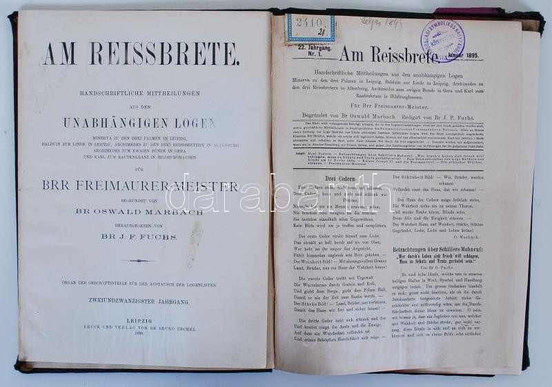 Leírás: Marbach, O.,: Am Reissbrete. Handschriftliche Mittheilungen aus den unabhängigen Logen. 1. Jahrgang. Leipzig 1895. Bruno Zechel. Szabadkőműves folyóirat. KIssé megviselt egészvászon kötésben. Beltartalom hibátlan. /
