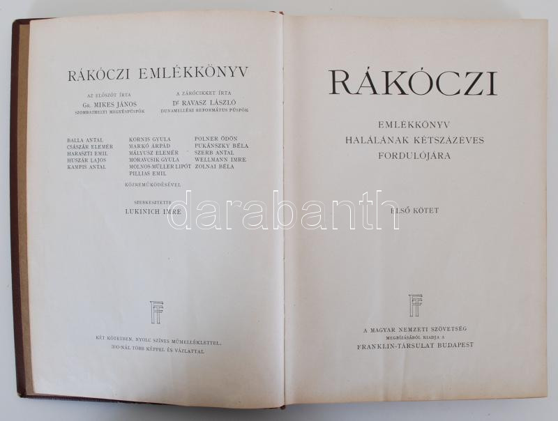 Leírás: Rákóczi emlékkönyv halálának kétszázéves fordulójára. Szerk.: Lukinich Imre. Előszó: Mikes János. I.II. kötet.
