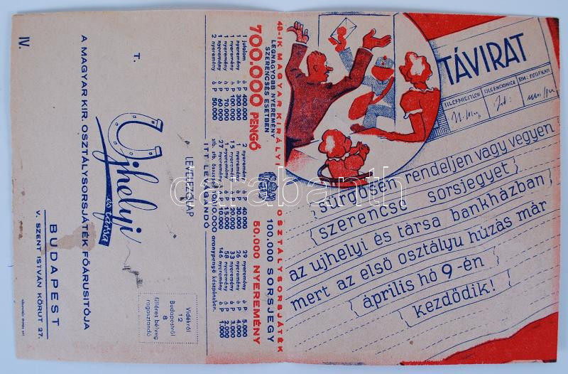 Ujhelyi és társa levelezőlap, sorsjegy húzást ismertető lap. https://www.darabanth.com/hu/173-Gyorsarveres/173.0/Festmeny-mutargy-papirregiseg-egyeb/Nyomtatvanyok~4000012/Ujhelyi-es-tarsa-levelezolap-sorsjegy-huzast-ismerteto-lap~II594557