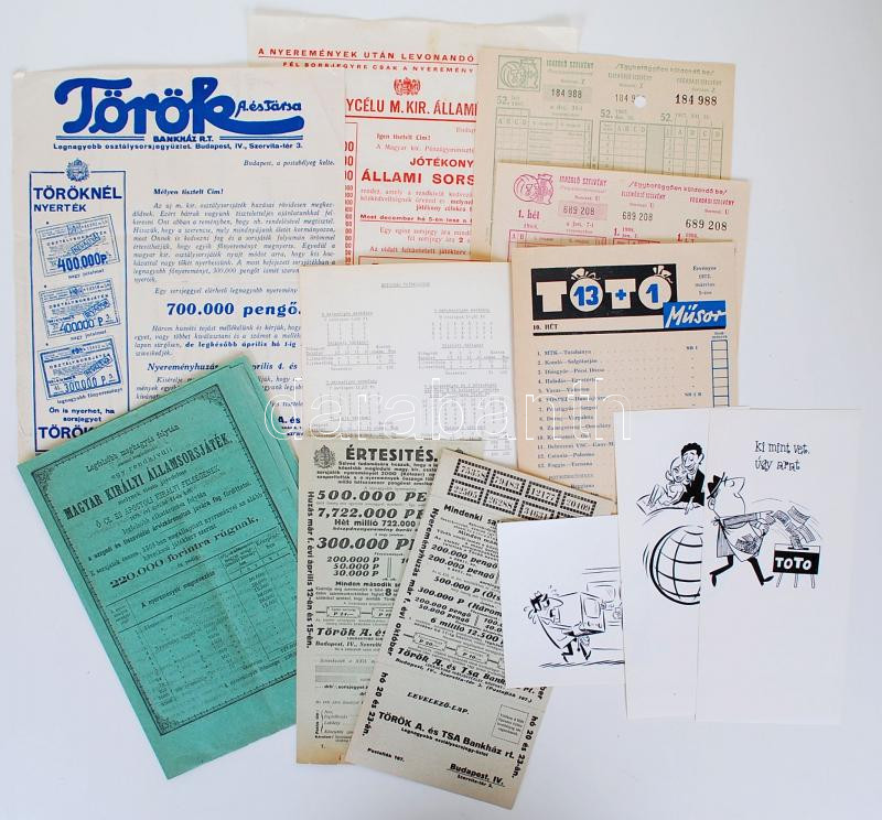 Leírás: 1879-cca1970 Szerencsejáték tétel, játékszelvények, reklámok, királyi államsorsjáték árvízkárosultak javára, stb.