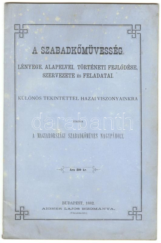 A szabadkőmüvesség lényege, alapelvei, történeti fejlődése, szervezete és feladatai. Különös tekintettel hazai viszonyainkra. Bp., 1882, A Magyarországi Szabadkőmüves Nagypáholy, 29p.