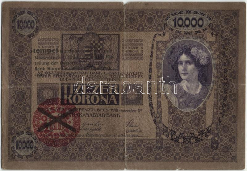 1918. 10.000K érvénytelenített Magyarország körbélyegzővel T:III- https://www.darabanth.com/hu/173-Gyorsarveres/173.0/Numizmatika/Magyar-es-magyar-vonatkozasu-bankjegyek~4000126/1918-10000K-ervenytelenitett-Magyarorszag-korbelyegzovel-TIII-~II595029
