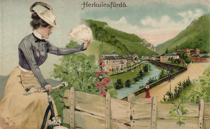 Herkulesfürdő, cyclist lady litho https://www.darabanth.com/hu/174-Gyorsarveres/174.0/Kepeslapok/Erdely~2200042/Herkulesfurdo-cyclist-lady-litho~II598780