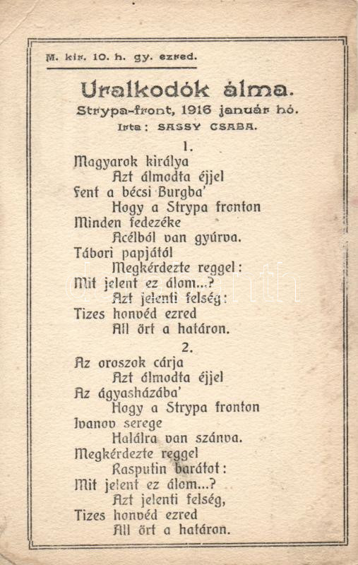 Uralkodók álma, Sassy Csaba verse, Strypa-front (EK) https://www.darabanth.com/hu/174-Gyorsarveres/174.0/Kepeslapok/Katonai~2200103/Uralkodok-alma-Sassy-Csaba-verse-Strypa-front-EK~II595183