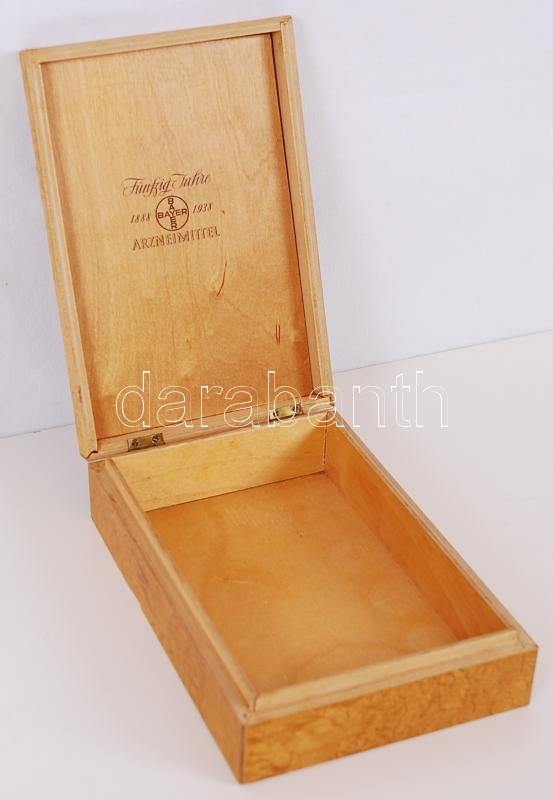 1938 intarziás gyógyszeres fadoboz, "Fünfzig Jahre Bayer", 12×18×5 cm https://www.darabanth.com/hu/175-Gyorsarveres/175.0/Festmeny-mutargy-papirregiseg-egyeb/Bolhapiac~1000015/1938-intarzias-gyogyszeres-fadoboz-Funfzig-Jahre-Bayer-12C39718C3975-cm~II604142