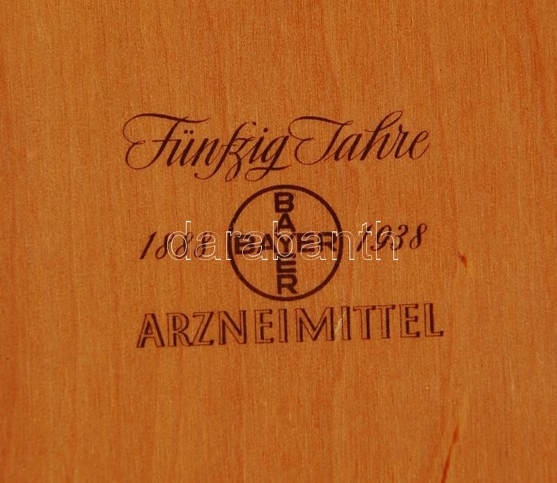 Leírás: 1938 intarziás gyógyszeres fadoboz, "Fünfzig Jahre Bayer", 12×18×5 cm