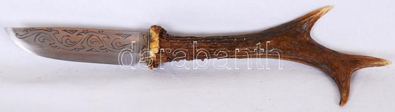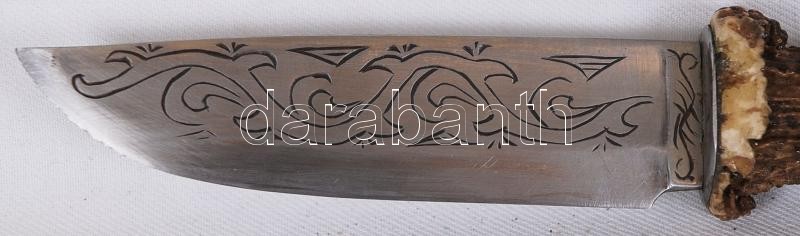 Leírás: Agancsnyelű, díszített pengéjű vadászkés övre erősíthető bőrtokban /