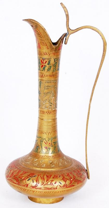 Leírás: Indiai sárgaréz kancsó vésett, zománcozott díszítéssel /