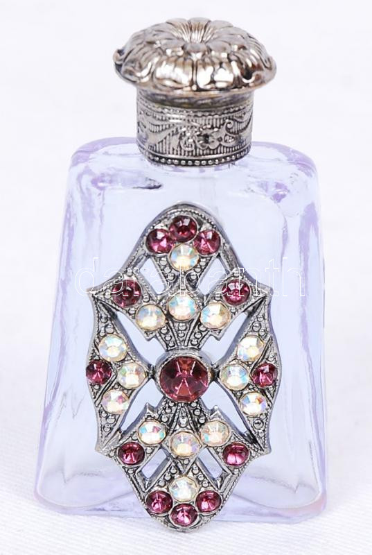 Leírás: Régi parfümös üvegcse fém- és kődíszekkel /