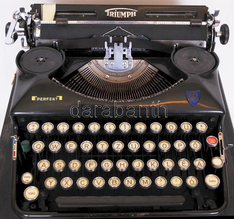 cca 1950 Triumph Perfekt írógép magyar billentyűkkel, eredeti tokjában... https://www.darabanth.com/hu/175-Gyorsarveres/175.0/Festmeny-mutargy-papirregiseg-egyeb/Bolhapiac~1000015/cca-1950-Triumph-Perfekt-irogep-magyar-billentyukkel-eredeti-tokjaban--3Cbr3ETypewriter-in-or~II607194