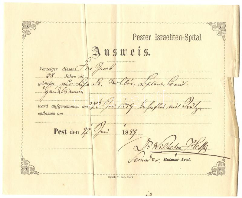 1899 A pesti zsidókórház ambuláns lapja a másodorvos aláírásával https://www.darabanth.com/hu/175-Gyorsarveres/175.0/Festmeny-mutargy-papirregiseg-egyeb/Judaika~1200075/1899-A-pesti-zsidokorhaz-ambulans-lapja-a-masodorvos-alairasaval~II605836
