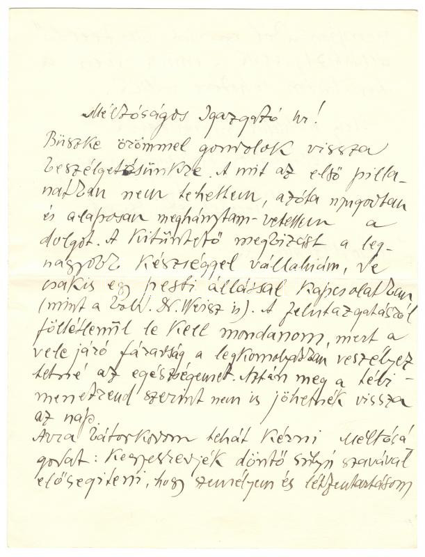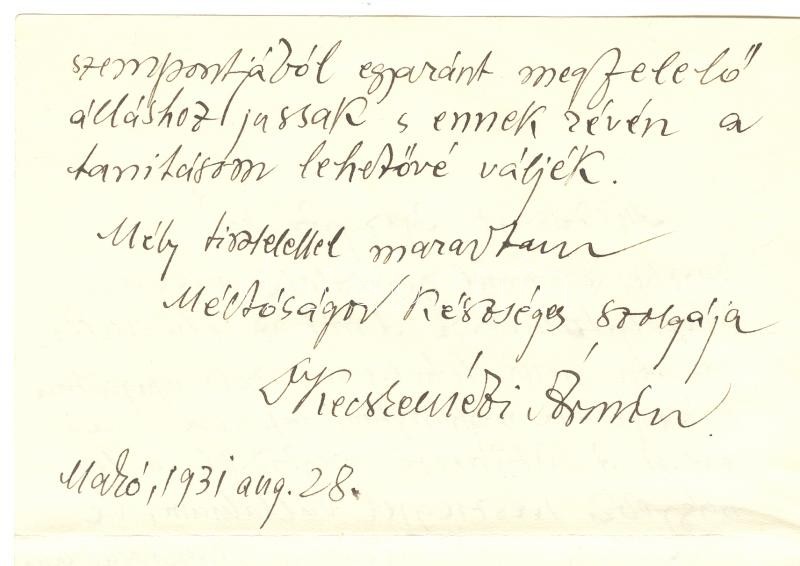 Leírás: 1931 Kecskeméti Ármin makói főrabbi saját kézzel írt levele Lyka Károlynak? melyben megfelelő állásért folyamodik 2 beírt oldal