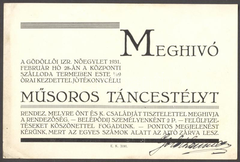 Leírás: 1931 a Gödöllői Izraelita Nőegylet meghívója