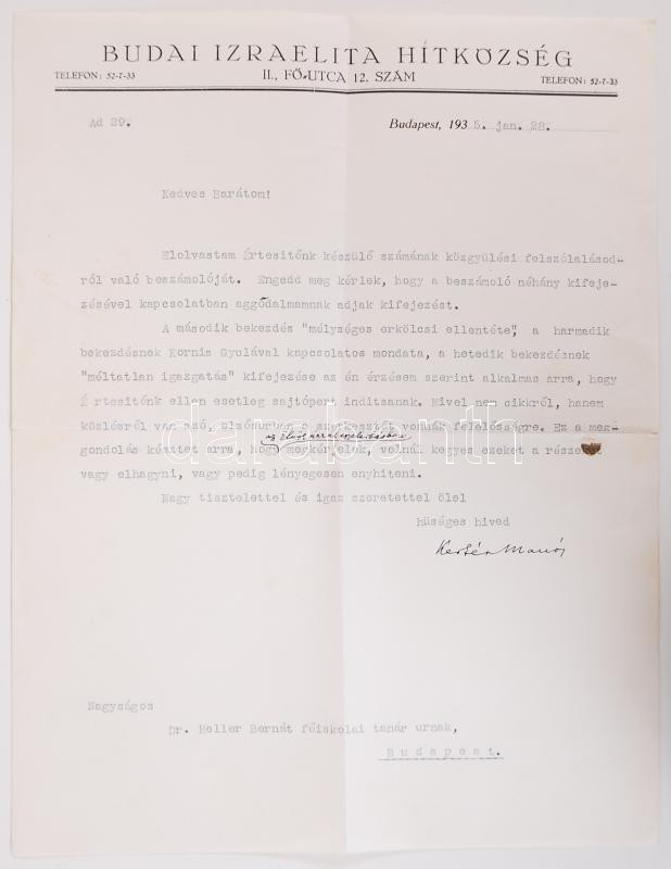 1935 Kertész Manó nyelvész levele Heller Bernátnak a Budai Izraelita Hitközség fejléces levélpapírján, melyben Hellert arra kéri, hogy az esetleges sajtópert megelőzendő finomítson készülő cikkén