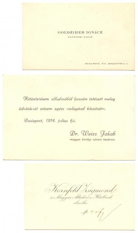 Goldziher Ignác, Kornfeld Zsigmond és Weisz Jakab névjegyei https://www.darabanth.com/hu/175-Gyorsarveres/175.0/Festmeny-mutargy-papirregiseg-egyeb/Judaika~1200075/Goldziher-Ignac-Kornfeld-Zsigmond-es-Weisz-Jakab-nevjegyei~II603923