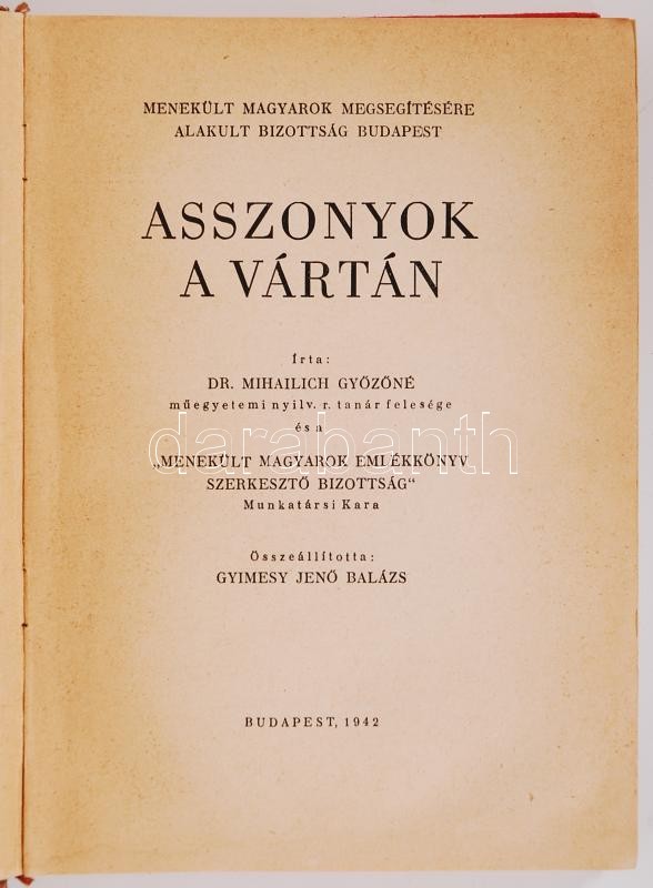 Dr. Mihailich Győzőné: Asszonyok a vártán. Bp., 1942, Menekült Magyarok Megsegítésére Alakult Bizottság Budapest. Kiadói aranyozott, dombornyomott félvászon kötésben, fotókkal illusztrálva