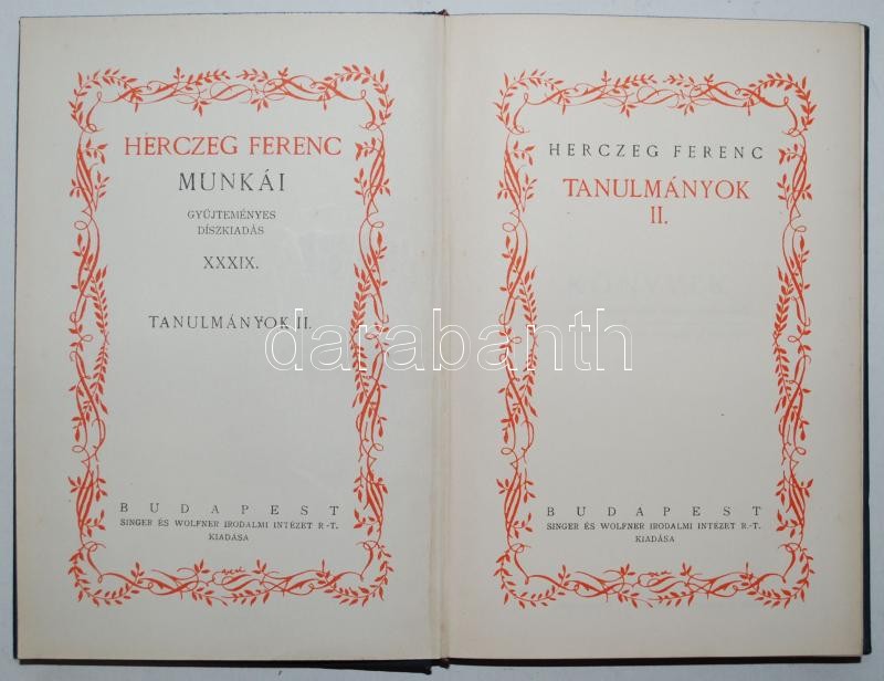 Leírás: Herczeg Ferenc: Tanulmányok I-II. (Herczeg Ferenc Munkái Gyűjteményes Díszkiadás XXXVIII-XXXIX.) Bp., 1925, Singer és Wolfner. Kiadói aranyozott egészvászon kötésben