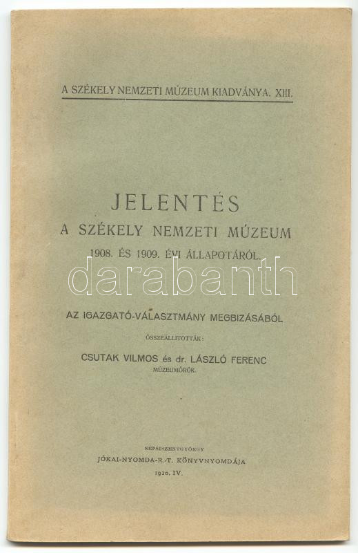 Jelentés a Székely Nemzeti Múzeum 1908. és 1909. évi állapotáról. Összeáll. Csutak Vilmos és dr. László Ferenc. Sepsiszentgyörgy, 1910, 68p. (Néhány ceruzás jelzéssel)