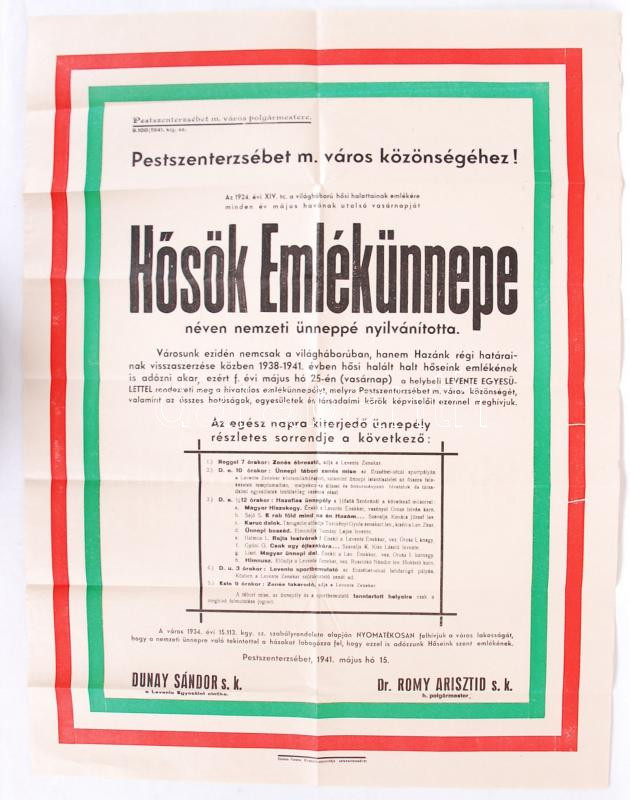 Leírás: 1941 Pesterzsébet katonai emlékünnep plakát 50x70 cm