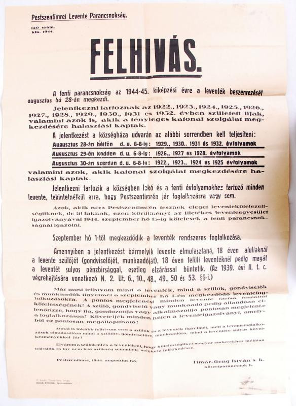 1944 Leventék bevonultatási plakát 40x60 cm https://www.darabanth.com/hu/175-Gyorsarveres/175.0/Festmeny-mutargy-papirregiseg-egyeb/Militaria~1000045/1944-Leventek-bevonultatasi-plakat-40x60-cm~II605833