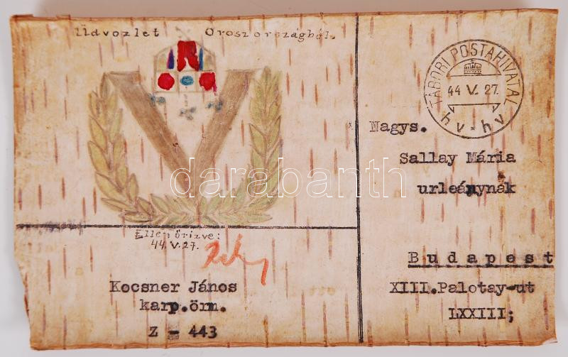 1944 Nyírfakéregre írt tábori levél Oroszországból, rajzzal https://www.darabanth.com/hu/175-Gyorsarveres/175.0/Festmeny-mutargy-papirregiseg-egyeb/Militaria~1000045/1944-Nyirfakeregre-irt-tabori-level-Oroszorszagbol-rajzzal~II604059