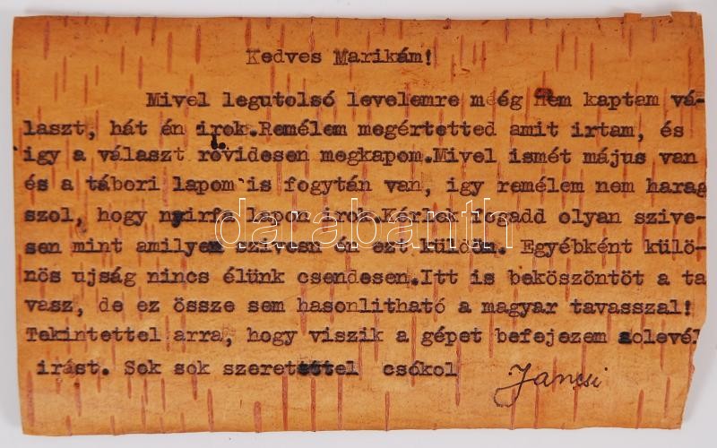 Leírás: 1944 Nyírfakéregre írt tábori levél Oroszországból, rajzzal