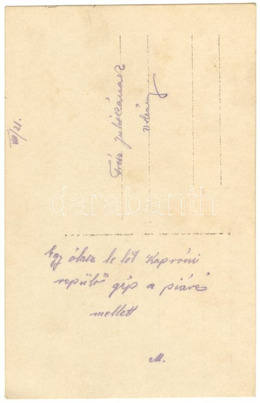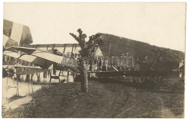 cca 1916 Olasz font: lelőtt olasz repülőgép a Piavénál fotólap. Hátoldalt a készítő feljegyzéseivel / Italian front: shoot Italian airplane photo 14x9 cm