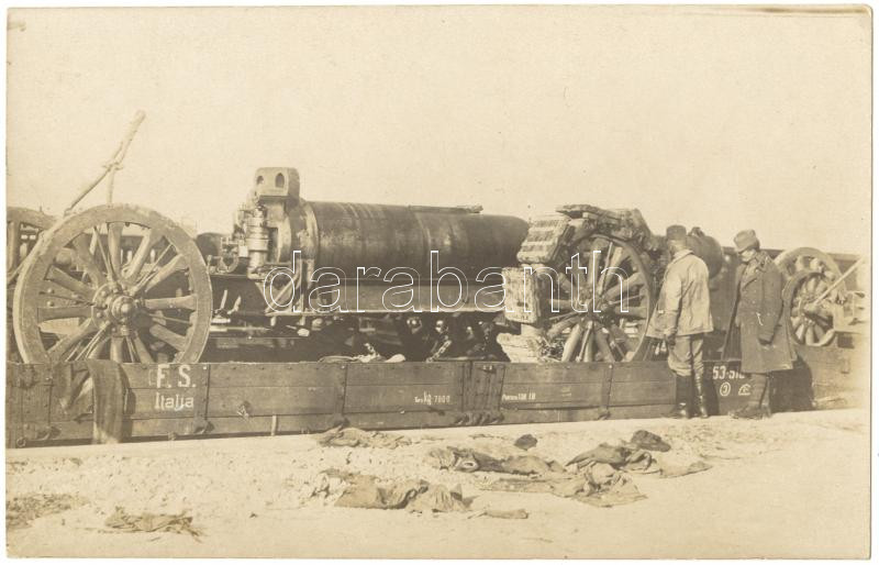 cca 1916 Olasz font: zsákmányolt olasz mozsárágyú vonatszerelvénnyel fotólap. Hátoldalt a készítő feljegyzéseivel / Italian front: captured italian mortar photo 14x9 cm
