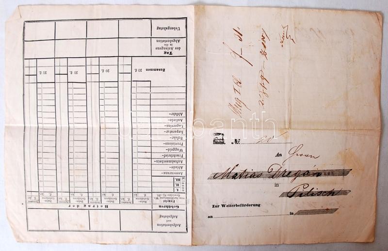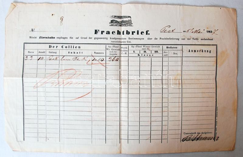 1857 Vasúti fuvarlevél Pesth-Pilisch / Railroad bill of freight https://www.darabanth.com/hu/175-Gyorsarveres/175.0/Festmeny-mutargy-papirregiseg-egyeb/Nyomtatvanyok~1000044/1857-Vasuti-fuvarlevel-Pesth-Pilisch-Railroad-bill-of-freight~II605823