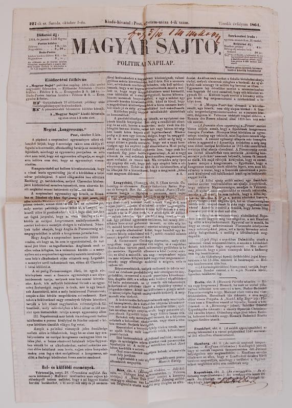 Leírás: 1864 A magyar Sajtó c. újság száma, benne az abonyi kaszinó verspályázata a modern divatot ostorozó költeményre.