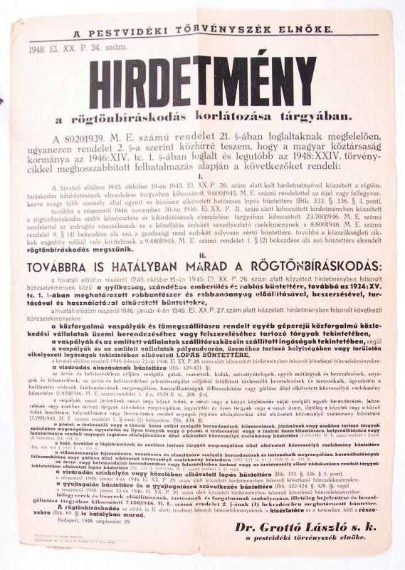 1948 A rögtönbíráskodás korlátozását bejelentő hirdetmény 40x60 cm https://www.darabanth.com/hu/175-Gyorsarveres/175.0/Festmeny-mutargy-papirregiseg-egyeb/Nyomtatvanyok~1000044/1948-A-rogtonbiraskodas-korlatozasat-bejelento-hirdetmeny-40x60-cm~II605811