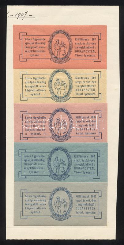 Leírás: 1907 Magyarországi munkások rokkant és nyugdíj egylete kiállítása 5 klf levélzáró