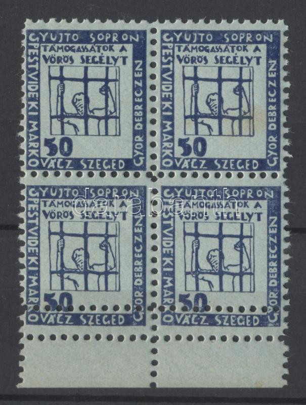 Leírás: Vörös segély 50f segélybélyeg ívszéli négyestömb, az alsó bélyegeken kettős fogazás