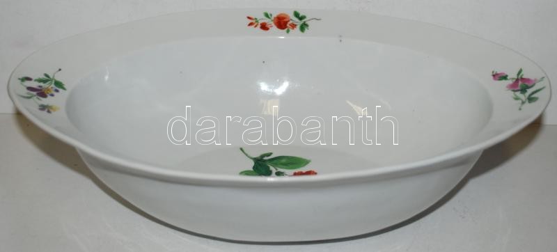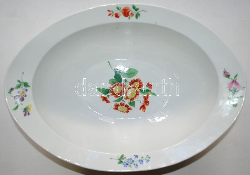 Leírás: Cca XX. sz. eleje Meisseni tál, kézzel festett, jelzett, restaurált, 37×27×10 cm