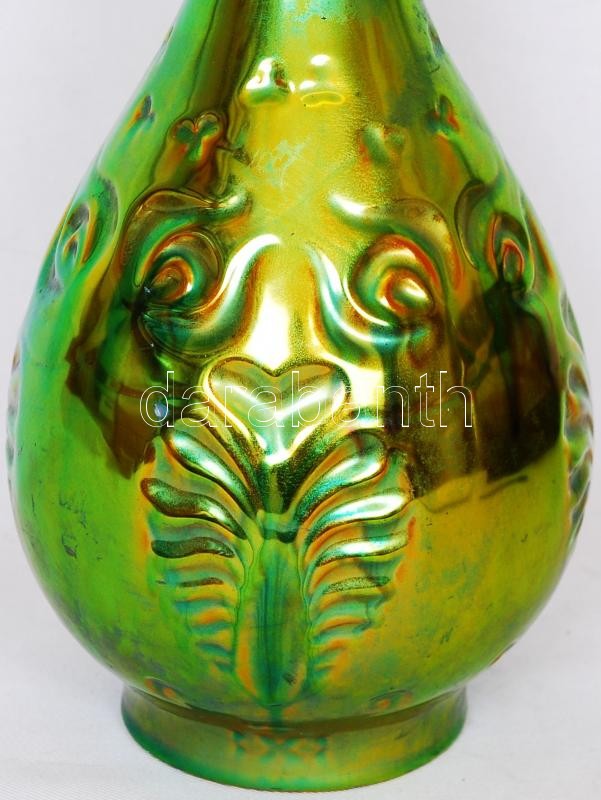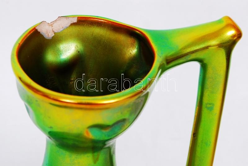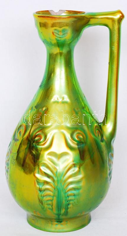 Leírás: Zsolnay eozinos kancsó, több helyen sérült, m:28 cm