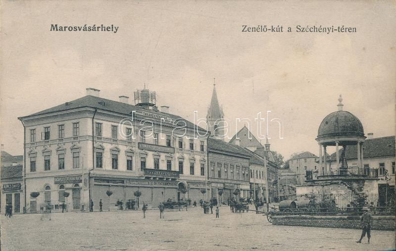 Marosvásárhely Széchenyi square, musical fountain, savings bank, Fonciere-the insurance agency of Pest, Mór Bergel's men clothing store of Budapest, Dávid Kincs's men and child clothing store, the shops of Sándor Harmath, Lajos Bucher, István Tutsek