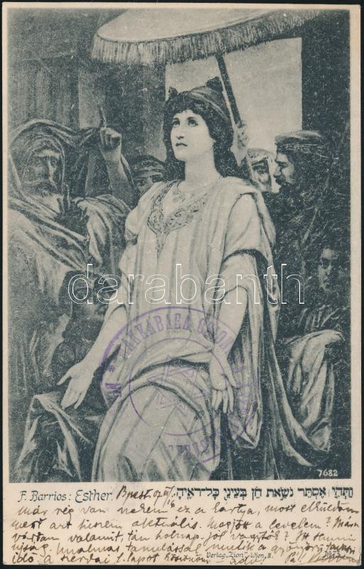 Leírás: Esther, Judaica, s: Barrios; A Makkabaea Czionista Asztaltársaság Budapesten pecséttel / with the stamp of the Hungarian Zionist Society