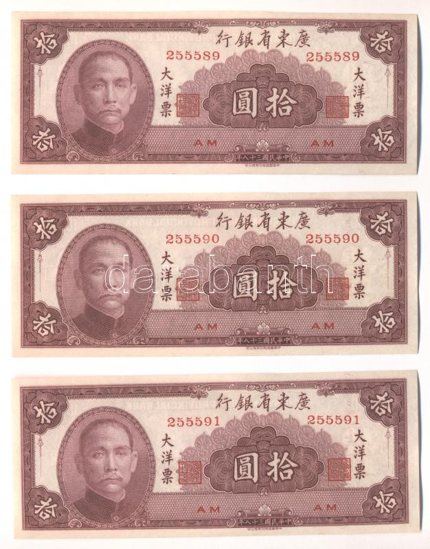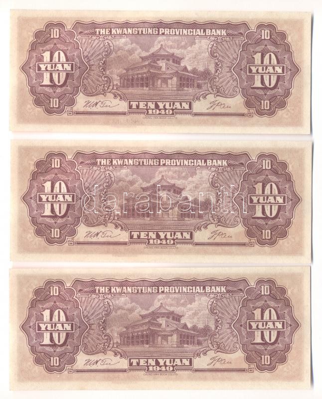 Kína/ Kwangtung Provincial Bank 1949. 10Y (3x) egymás utáni sorszámmal T:I