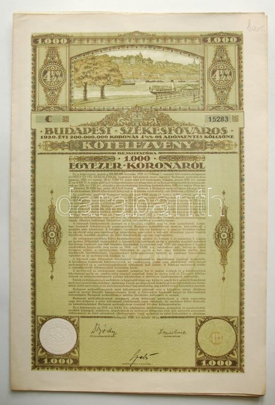 1920. "Budapest Székesfőváros" kötelezvénye 1000K-ról szelvényekkel ma... https://www.darabanth.com/hu/175-Gyorsarveres/175.0/Numizmatika/Reszvenyek-es-sorsjegyek~1200084/1920-Budapest-Szekesfovaros-kotelezvenye-1000K-rol-szelvenyekkel-magyar-es-nemet-nyelven~II577682