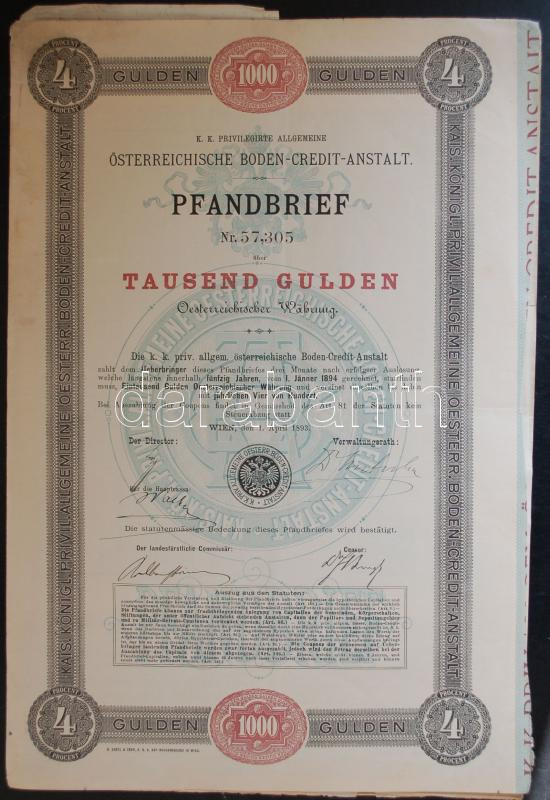Austria / Vienna 1893. "Österreichische Boden-Credit-Anstalt Pfandbrief 1000 Gulden" with coupons