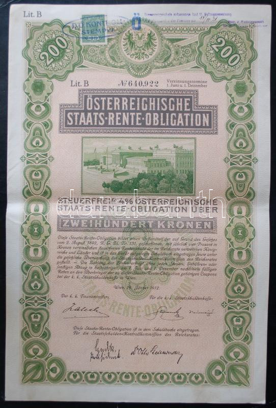 Ausztria / Bécs 1912. "Österreichische Staats-Rente-Obligation" 200 Koronáról szelvényekkel T:egyszer hajtva
