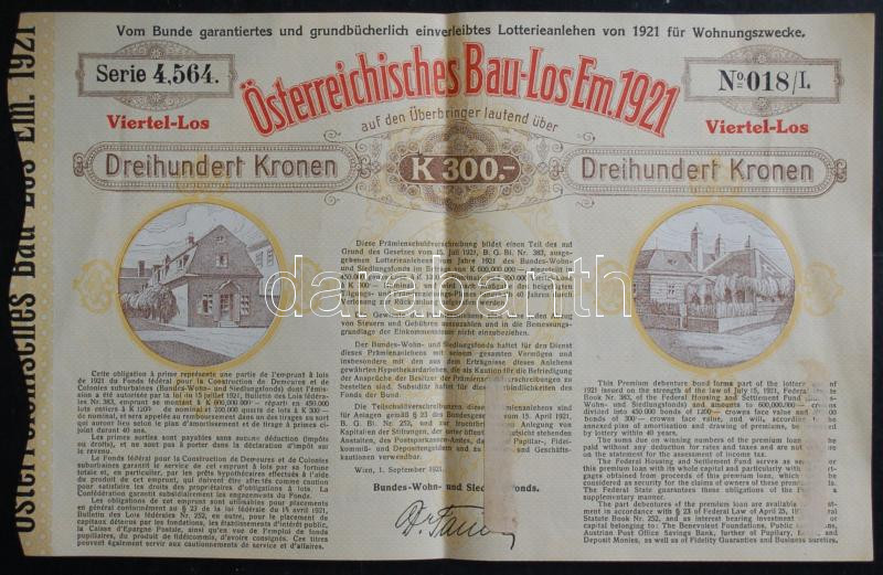 Leírás: Ausztria / Bécs 1921. "Österreichisches Bau-Los Em.1921" nyereménykötvény 300 Koronáról T:egyszer hajtva, papírnyom