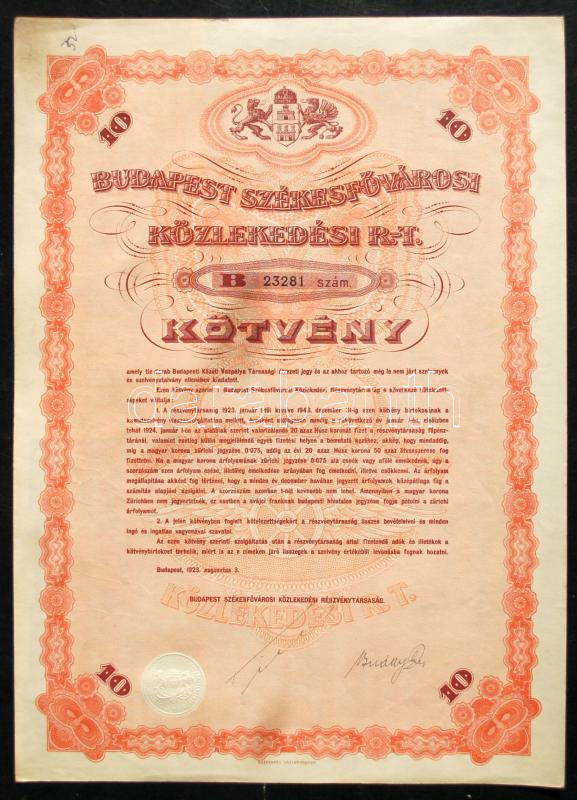Budapest 1923. Budapest Székesfővárosi Közlekedési Részvénytársaság kö... https://www.darabanth.com/hu/175-Gyorsarveres/175.0/Numizmatika/Reszvenyek-es-sorsjegyek~1200084/Budapest-1923-Budapest-Szekesfovarosi-Kozlekedesi-Reszvenytarsasag-kotvenye-szelvenyekk~II607943