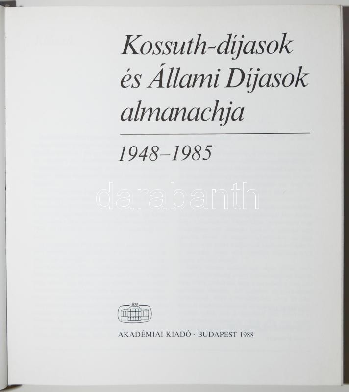Kossuth-díjasok és állami díjasok almanachja 1948-1954. Budapest 1986.... https://www.darabanth.com/hu/176-Gyorsarveres/176.0/Festmeny-mutargy-papirregiseg-egyeb/Konyvek-Tortenelem~2000026/Kossuth-dijasok-es-allami-dijasok-almanachja-1948-1954-Budapest-1986-Akademia-Kiado~II612626